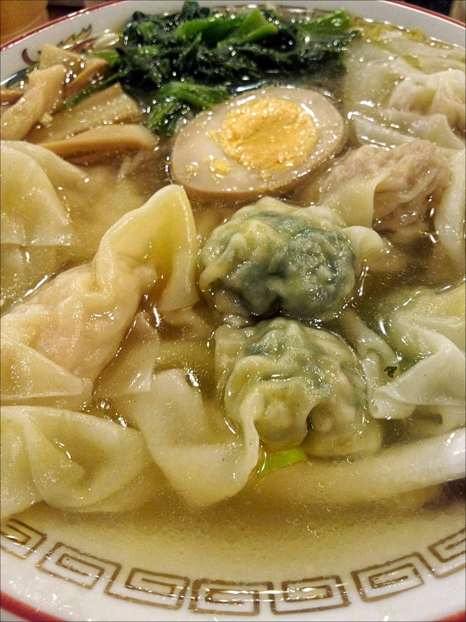 きれいなスープ煮玉子、青菜、シナチク。 そしてワンタンが3種類×3個の大盤振る舞いヽ(・∀・)ノ