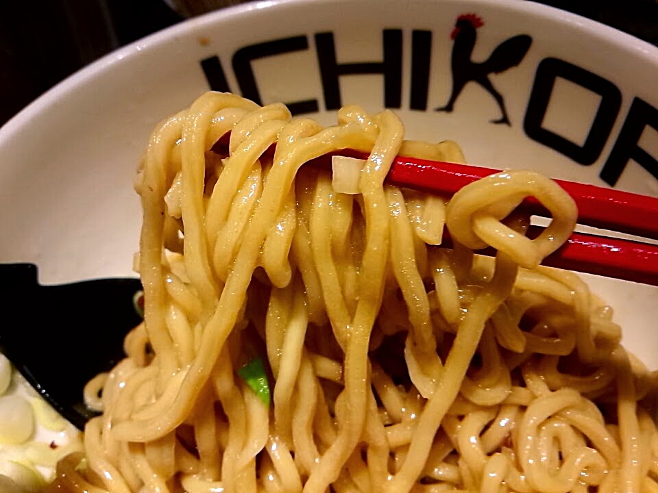 鶏そばの白湯スープをもっと濃くしたようなタレが太麺に絡まり最高です!濃厚な鶏の旨味、香り、そこにトッピングの揚げネギの風味が加わって食欲を煽ってきます。ん~これはウマイ。