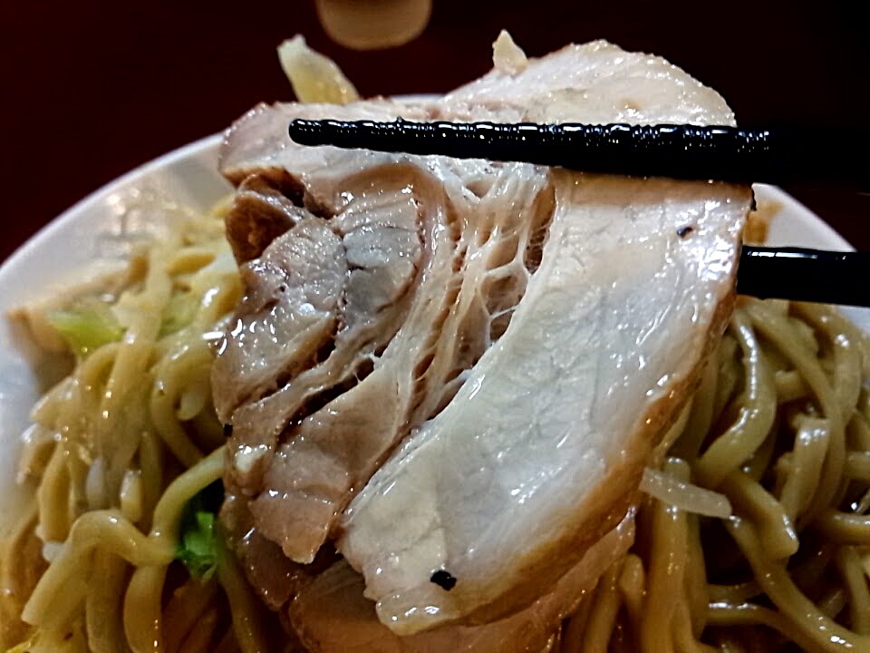 しっかり厚めな豚さんも油でテッカテカ、柔らかくて厚みもありジューシー!これは美味しい豚さんです。煮込みすぎてパサパサなのは残念ですからね~。ただ欲を言えばお肉が暖かいといいんだけどね~。今回は天地返しした麺で埋めて温めます。