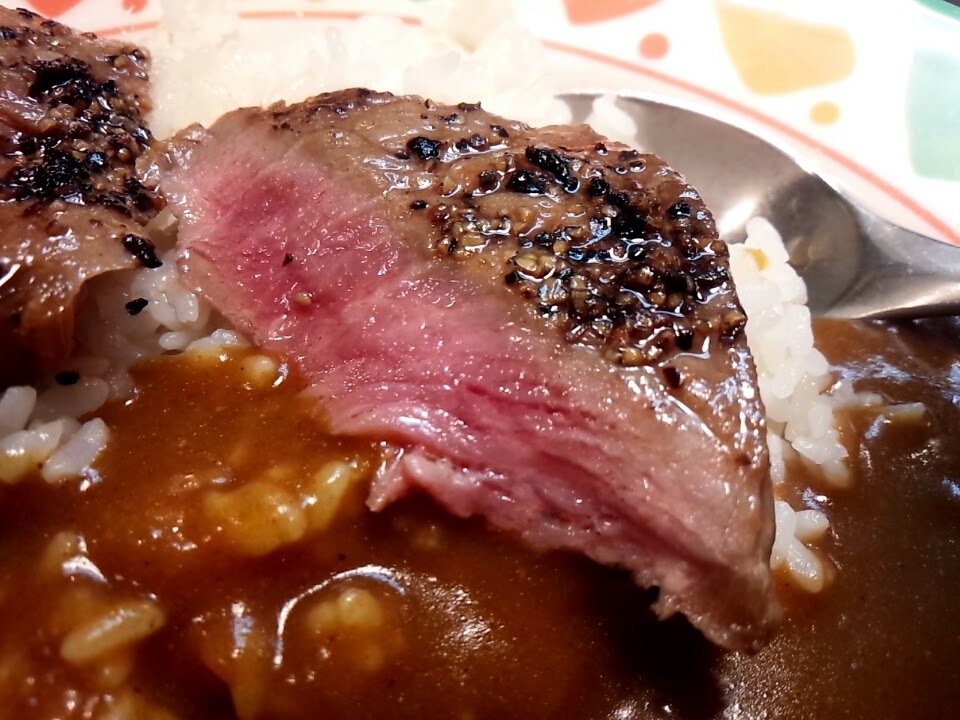 ステーキはなかなかに柔らかいお肉でミディアムな焼き加減で普通に美味く食べれます。最初は小さいとは思いましたがこれだけでカレーのご飯完食できるんじゃないかな。塩コショウを強めにきかせてご飯お替わりしたくなります。
