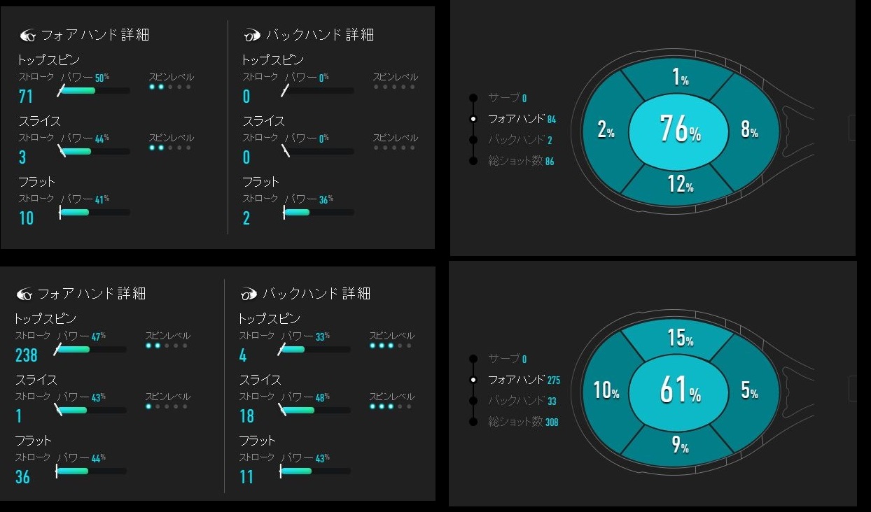 軽く振るようにしているのですが、パワーやスピン量が普段をほとんど変わらないのにビックリ。やっぱり力いっぱい叩く必要は無いんだなぁ~。リラックスして振るとラケットヘッドの重さやガットの上をボールが転がるような感覚、なによりヘッドが走ってる感があるんですよね。